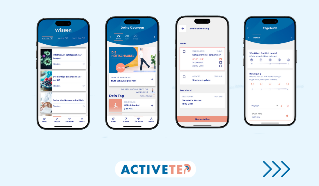 ActiveTEP ist deine digitale Begleitung vor, während und nach einer Hüftoperation. Die Gesundheitsapp unterstützt dich über sechs Monate – drei Monate vor und drei Monate nach dem Eingriff – mit hilfreichen Informationen, gezielten Übungen und motivierenden Impulsen. So gestaltest du deine Genesung selbstbestimmt, sicher und mit einem klaren Ziel vor Augen.